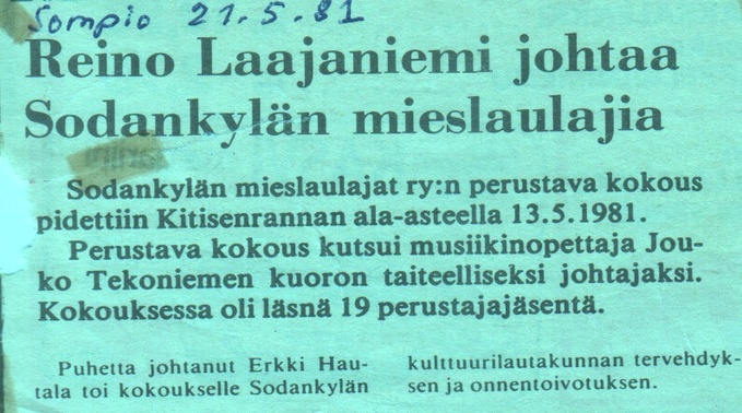 Varuskunnassa palveli aikanaan muutama mieskuorotaustan omaava henkilö. Sen lisäksi oli innokkaita laulumiehiä yhteensä noin tuplakvartetin verran. Esiinnyttiin joukko-osaston ja kerhojen juhlissa. Sitten syntyi ajatus mieskuoron perustamisesta Sodankylään. Erkki Hautala laitettiin kokoonkutsujaksi. Paikalle saapui 19 perustajajäsentä ja niin syntyi yhdistys nimeltään Sodankylän Mieslaulajat ry. Yhdistys rekisteröityi Mieskuoroliitto / Sulasolin jäseneksi 13.5.1981.